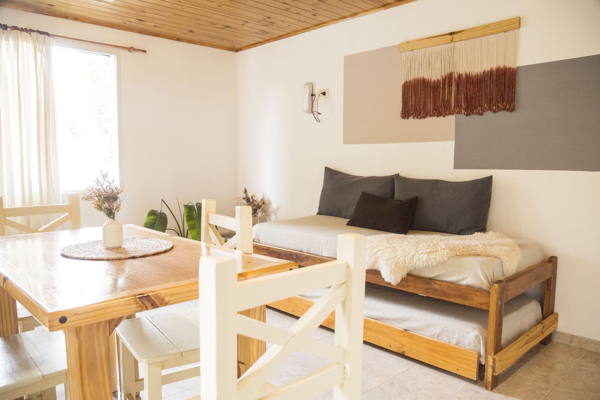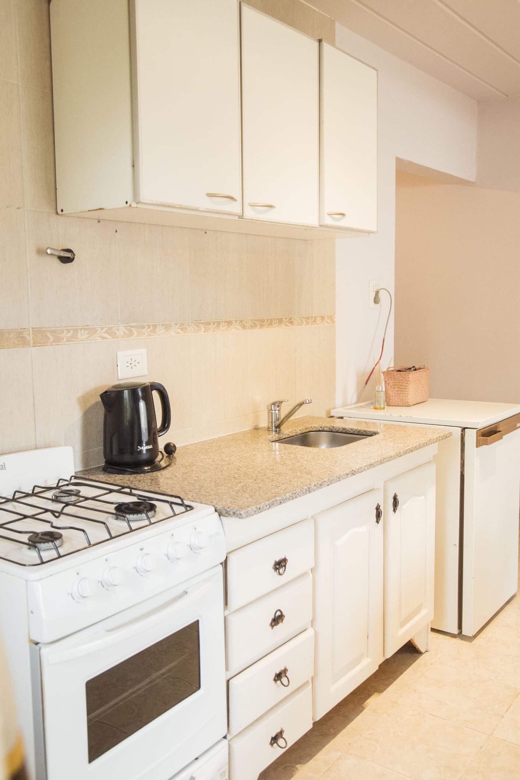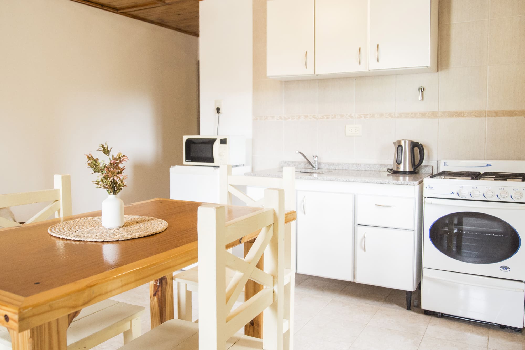 - Cocina, comedor (heladera, pava eléctrica, cocina con horno eléctrico, vajilla completa, tostadora, cafetera y mesa con sillas).