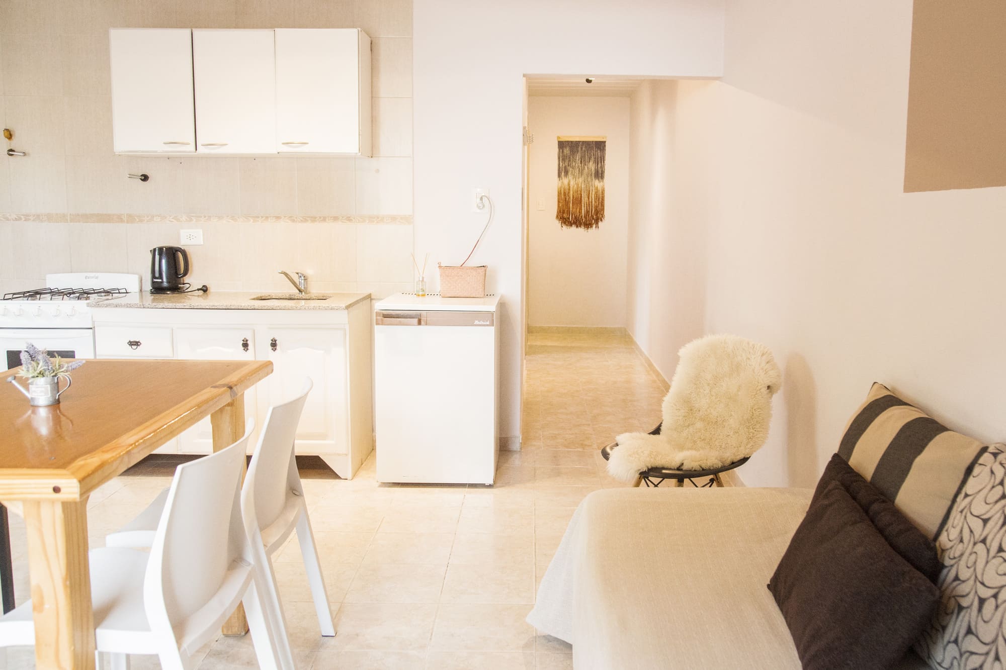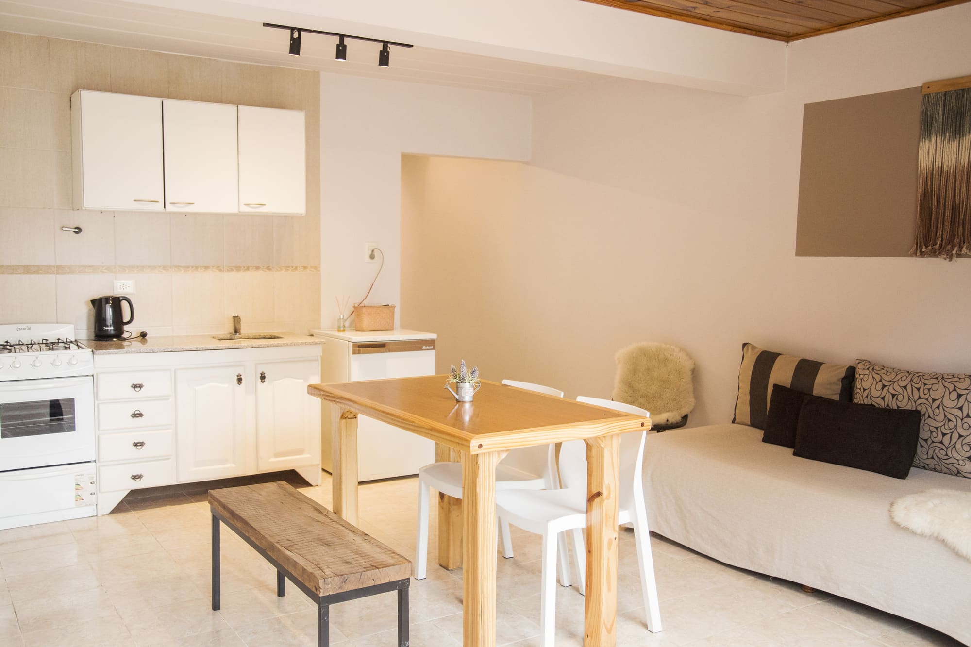 - Cocina, comedor (heladera, pava eléctrica, cocina con horno, vajilla completa y mesa con sillas)